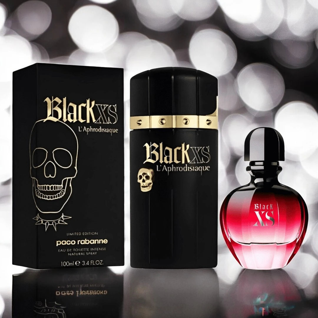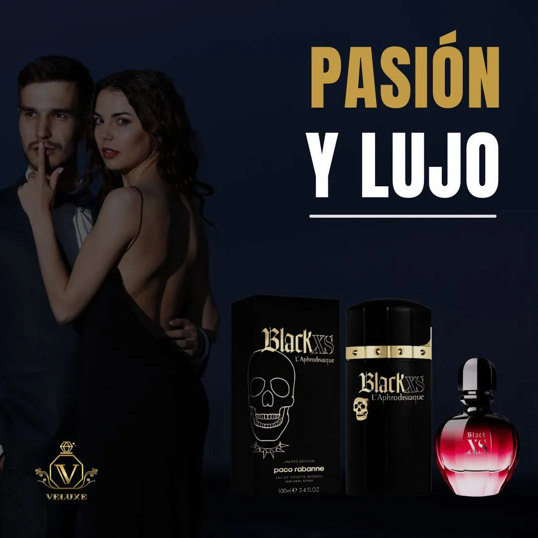 Black XS Afrodisíaco para hombre, una fragancia de cuero con notas de azafrán, canela y miel, que aporta una intensidad magnética. Para ella, Black XS L'Exces ofrece un aroma oriental floral con toques de neroli, jazmín y vainilla, brindando una sensualidad audaz. Juntos, forman una pareja de fragancias que encarnan pasión y elegancia.