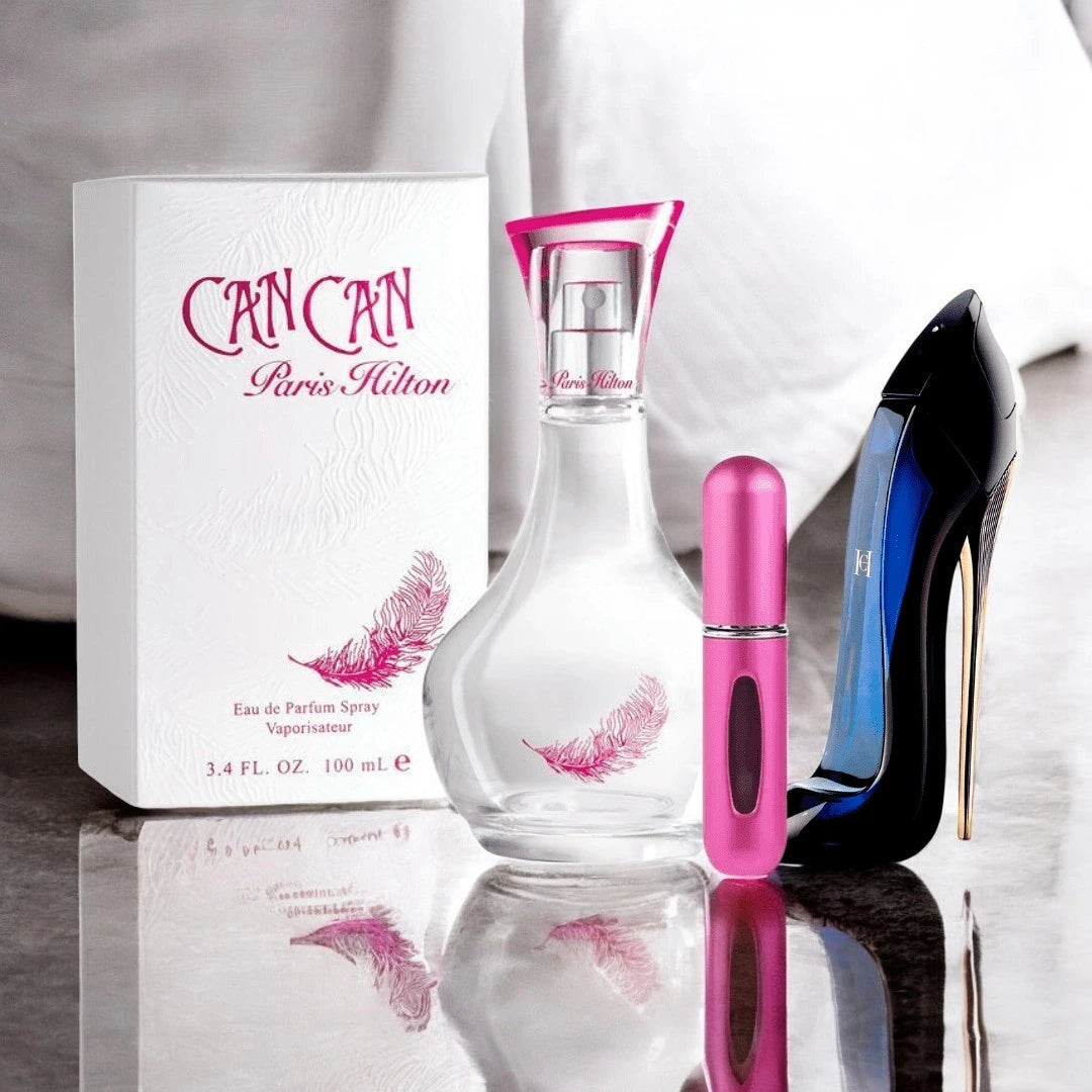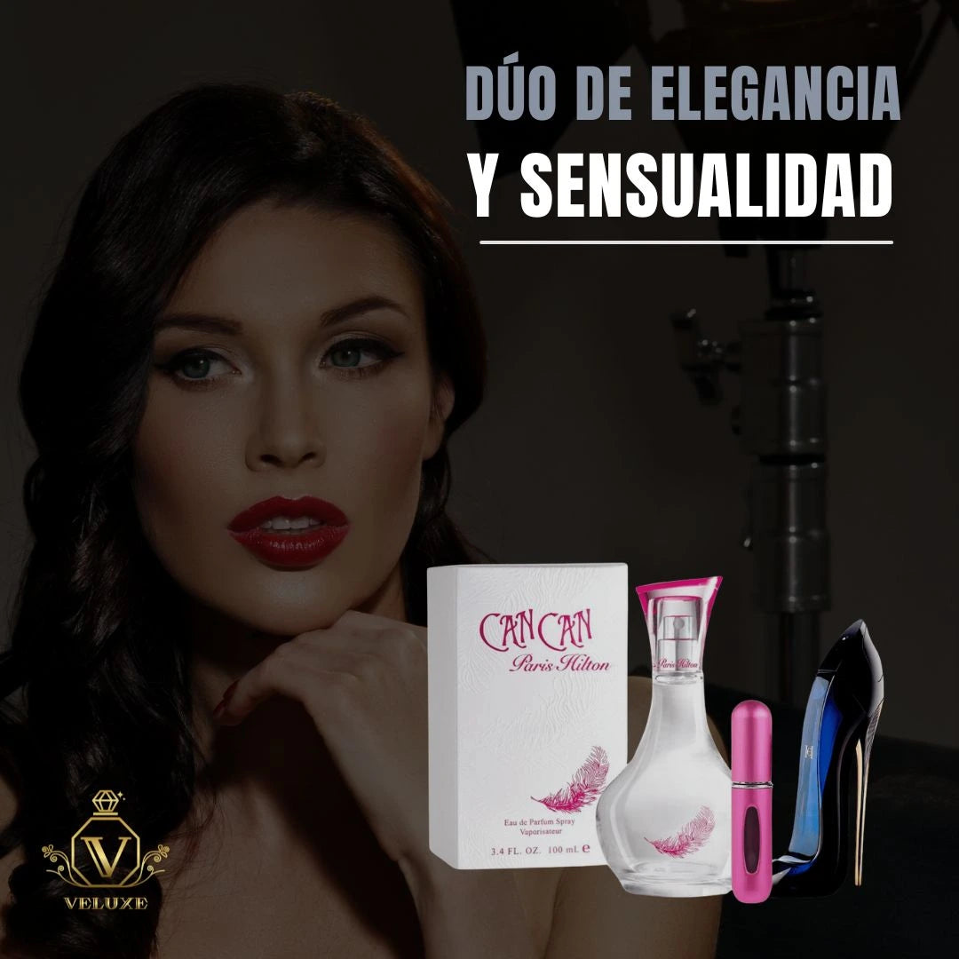 Disfruta de la dulzura y sensualidad de Can Can, con su mezcla de notas frutales y florales, junto a la sofisticación y misterio de Good Girl, que equilibra notas orientales y florales. El conjunto se completa con un atomizador recargable, ideal para mantener tu fragancia siempre a mano.