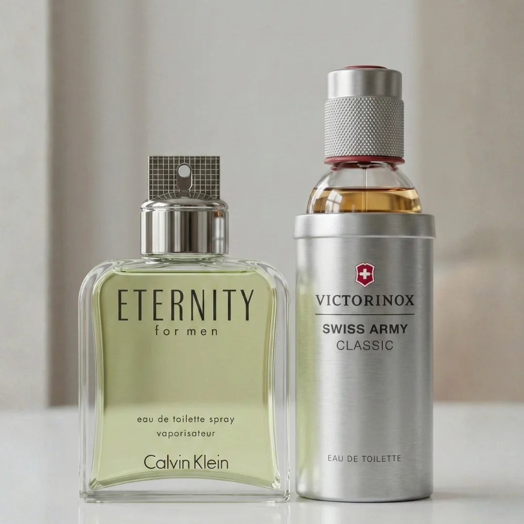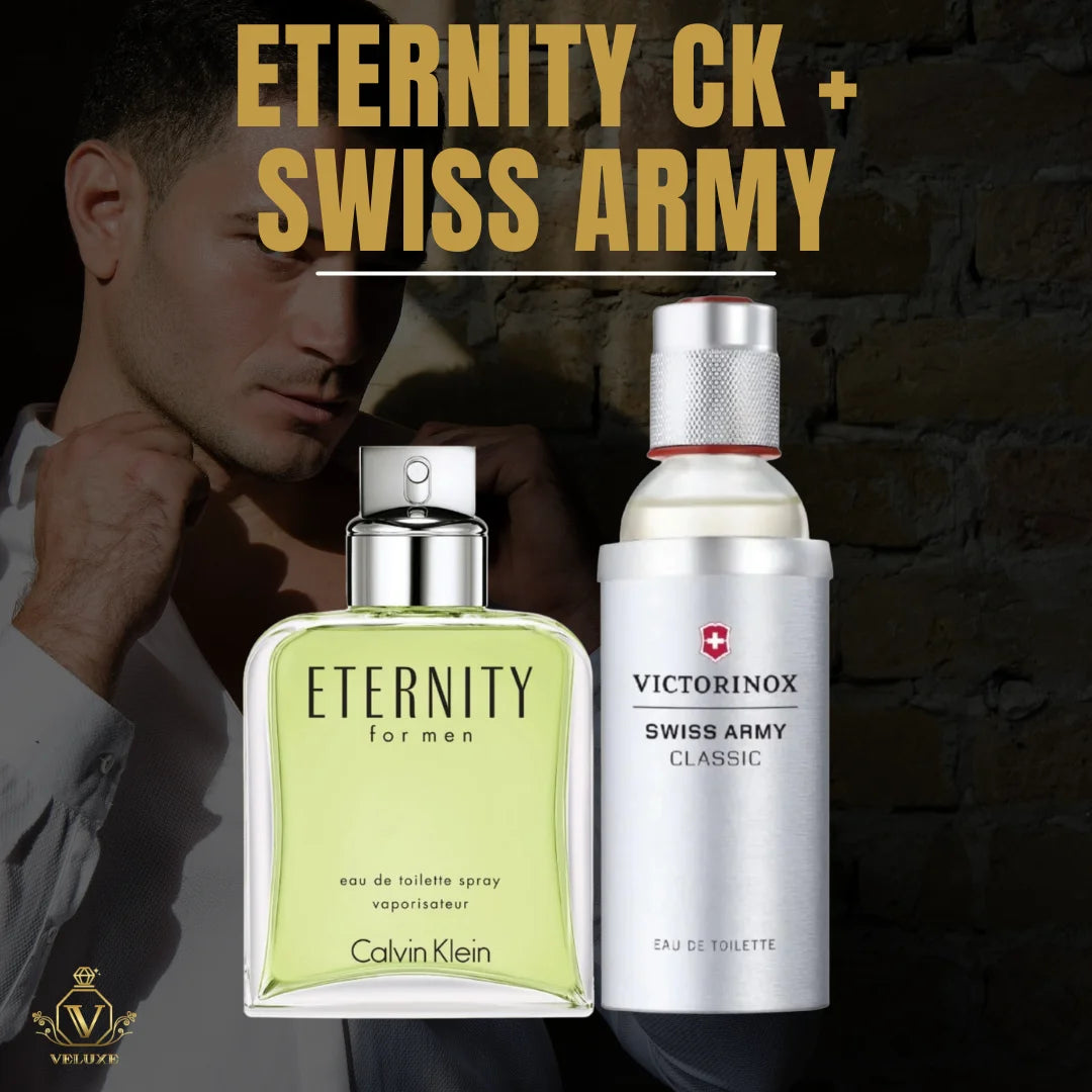 Este combo reúne dos perfumes icónicos: Eternity For Men, con notas cítricas y aromáticas como lavanda y mandarina, y Swiss Army, que aporta frescura con menta, yuzu y jengibre.
