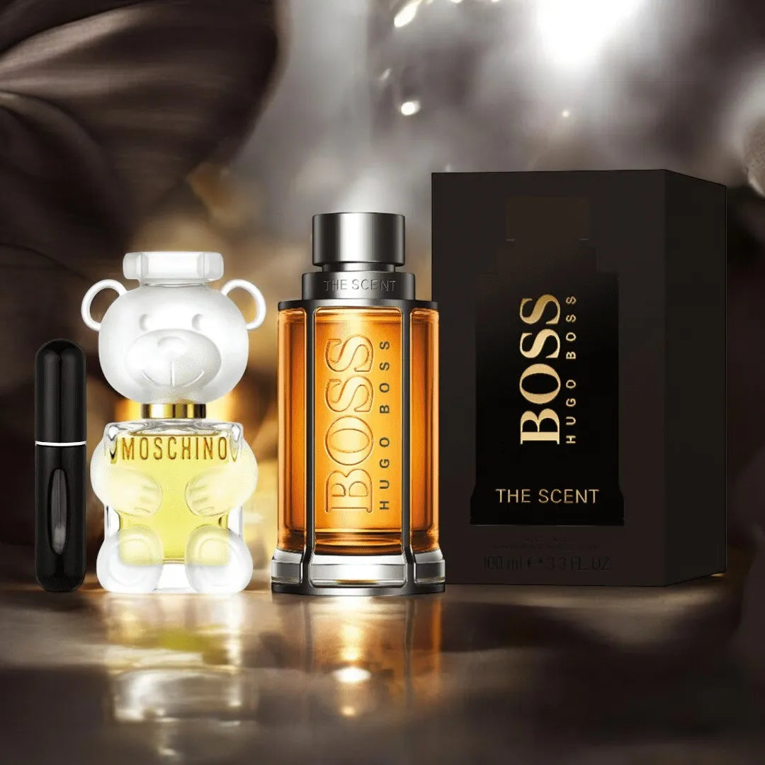 Este combo presenta Hugo Boss The Scent para hombres, una fragancia que combina notas de jengibre, maninka y cuero, ofreciendo un aroma seductor y sofisticado. Se complementa con Moschino Toy 2 para mujeres, una esencia fresca que fusiona notas de manzana, magnolia y peonía, brindando una fragancia alegre y moderna. Incluye un atomizador recargable para llevar tus perfumes favoritos a cualquier lugar.