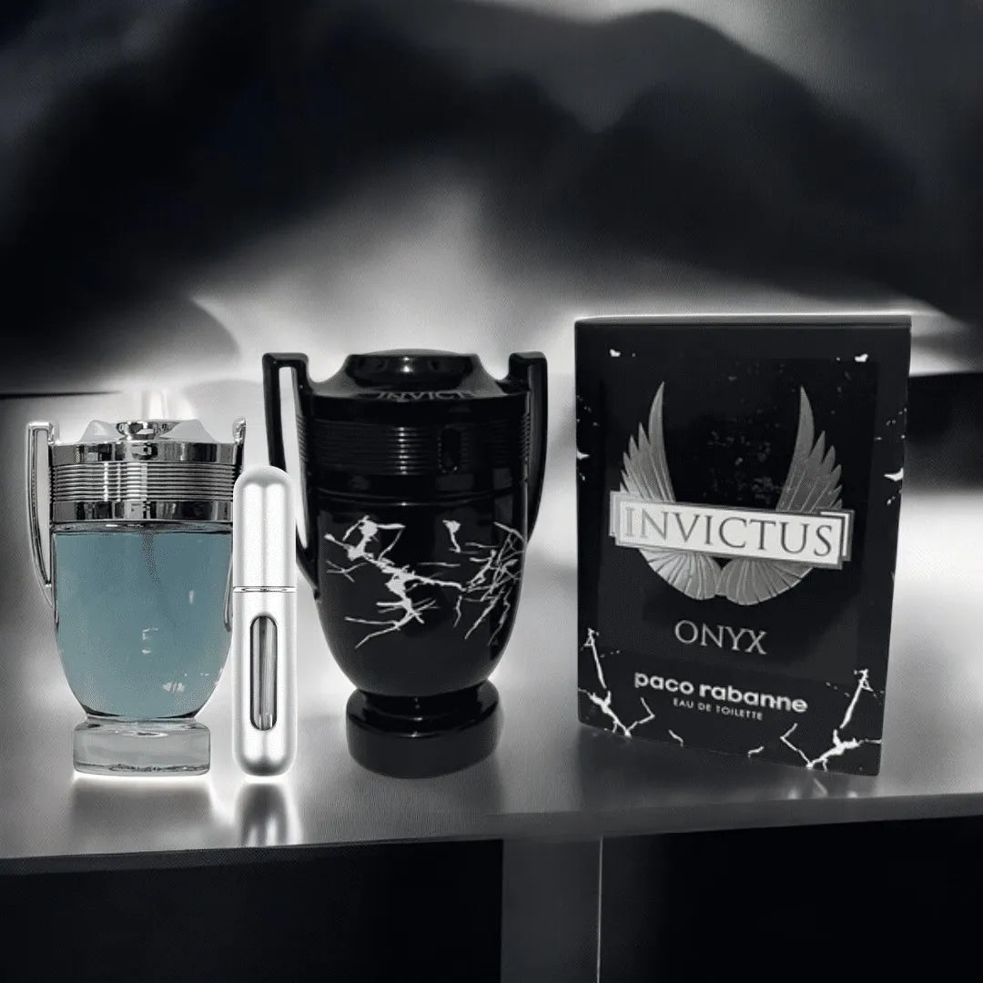 Este combo masculino presenta Invictus Onyx, una edición especial que mantiene la esencia fresca y amaderada del Invictus original, con notas de salida de toronja y acordes marinos, corazón de hoja de laurel y jazmín, y fondo de ámbar gris, madera de gaiac y pachulí. Incluye un atomizador recargable para llevar tu fragancia favorita a cualquier lugar.