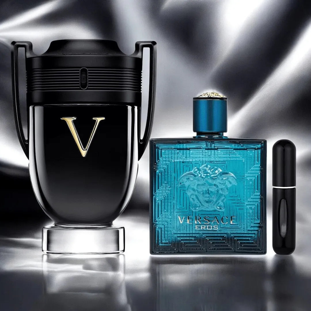 Este combo masculino presenta Invictus Victory, una fragancia oriental amaderada con notas de limón, incienso y vainilla, que ofrece una intensidad seductora. Se complementa con Versace Eros, una esencia fresca y vibrante que combina menta, manzana verde y vainilla, reflejando la pasión y el deseo. Incluye un perfumero recargable para llevar tu aroma favorito a cualquier lugar.
