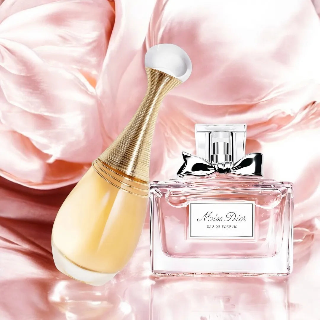 Sumérgete en la feminidad exquisita de J’adore, que envuelve con su aroma delicado y atemporal. Acompañado por el encanto romántico de Miss Dior, que ilumina con su esencia floral y apasionada.