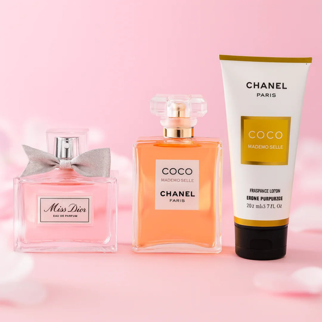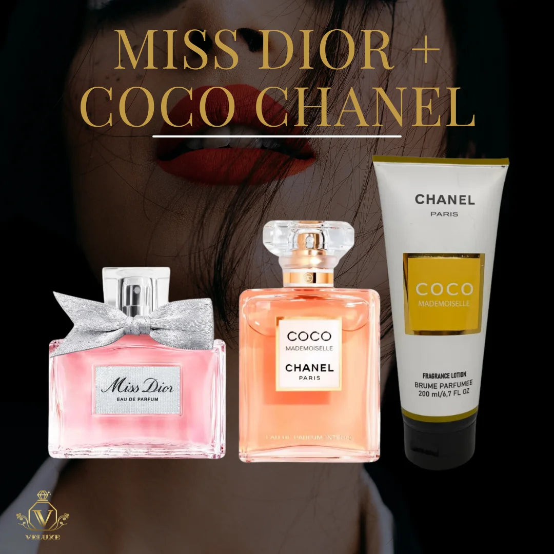 Miss Dior ofrece una floración jugosa y sofisticada 🌹, mientras que la crema Chanel realza esa feminidad con luminosidad cítrica y suavidad aterciopelada. ¡Juntas crean una experiencia olfativa encantadora!