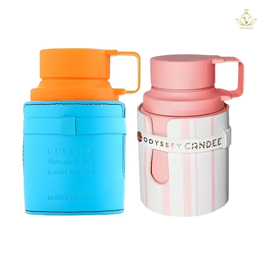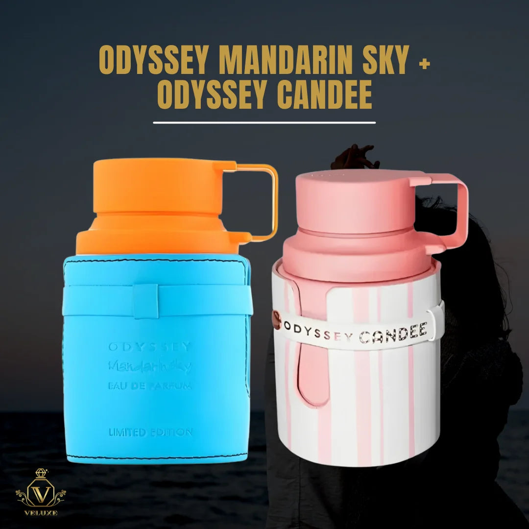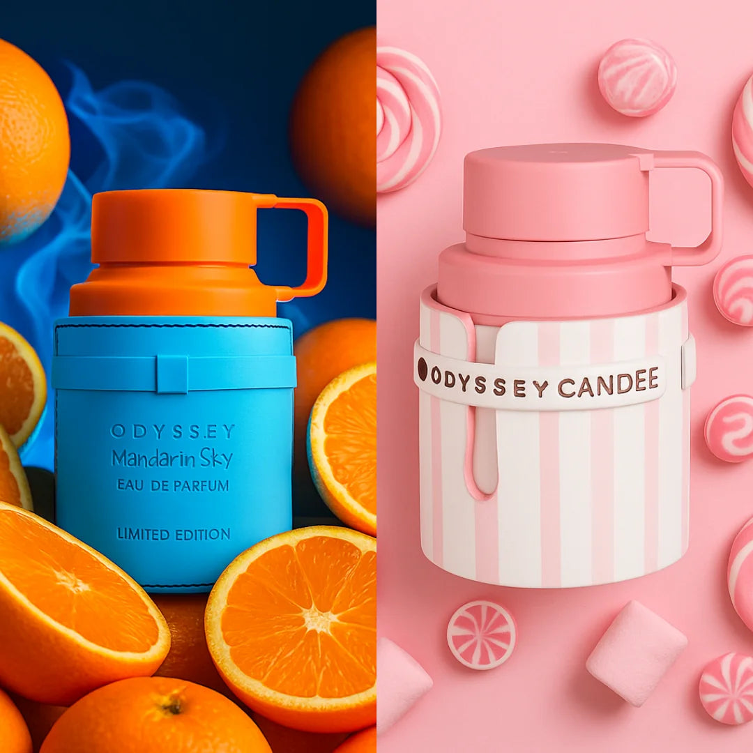 Odyssey Mandarin Sky inicia con un estallido cítrico de mandarina, naranja y azafrán sobre una base especiada y amarga salvia, mientras Odyssey Candee abre con notas jugosas de fresa, frambuesa, durazno y bergamota. Juntos crean una armonía que combina frescura vibrante y ternura afrutada