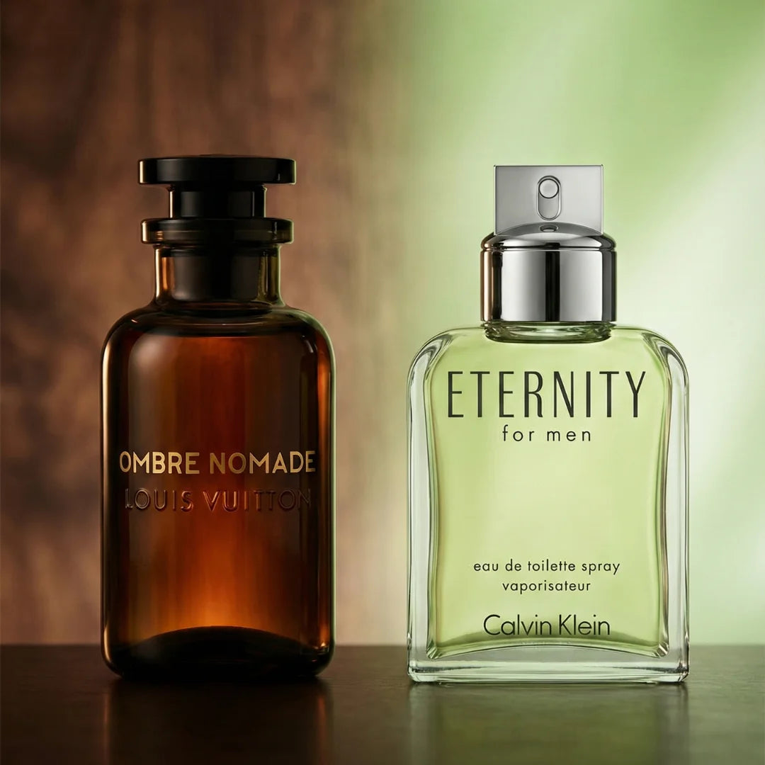 Mientras Ombre Nomade evoca un viaje olfativo al corazón del desierto con oud, incienso y benjuí, Eternity for Men ofrece un perfil cítrico-herbal fresco y versátil.