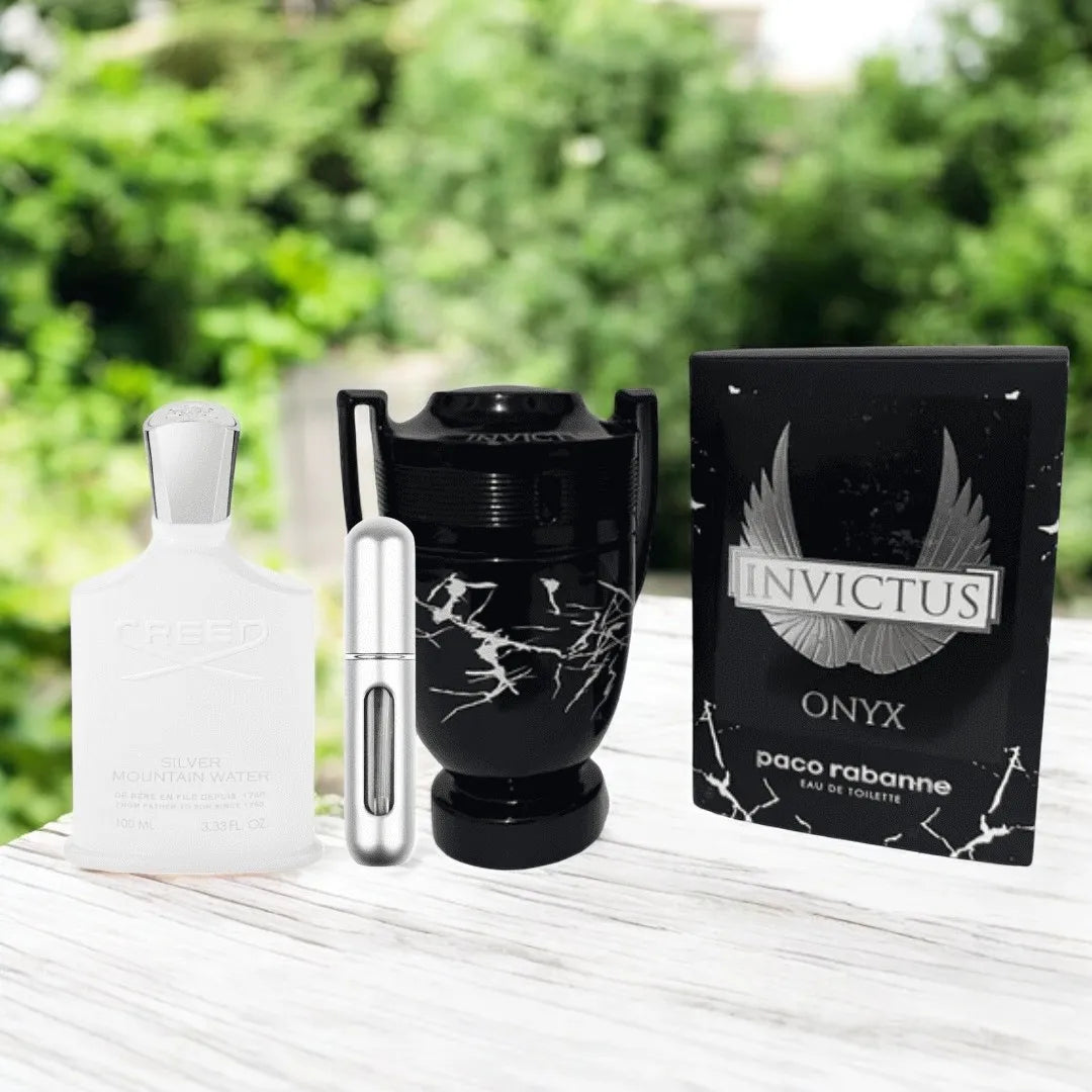 Este combo presenta Invictus Onyx, una fragancia masculina con notas de ámbar y madera que inspiran fuerza y masculinidad, junto a Silver Mountain Water de Creed, una esencia fresca y pura con matices cítricos y acuáticos. Una combinación que une intensidad y frescura para destacar.