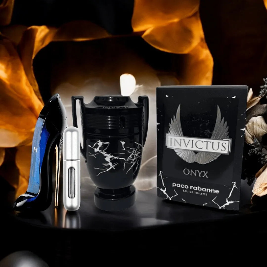 Este combo une Invictus Onyx, una fragancia masculina que destaca por sus notas ambarinas y amaderadas, reflejando fuerza y virilidad, con Good Girl de Carolina Herrera, un perfume femenino con notas de jazmín y cacao que seducen con su dulzura intensa. Un balance perfecto entre audacia y encanto.