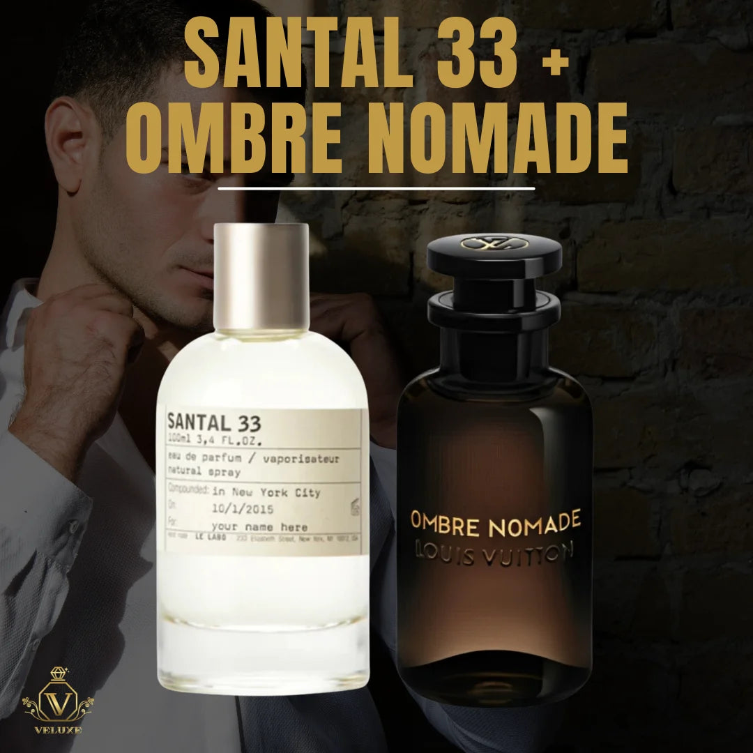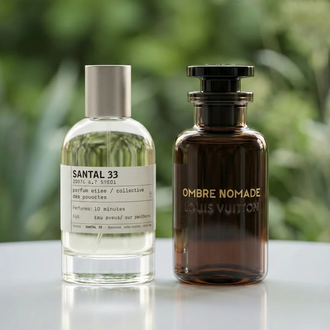 Santal 33 funciona con su perfil elegante y suave para el día, y Ombre Nomade destaca por su intensidad en la noche — un combo completo para cada ocasión.