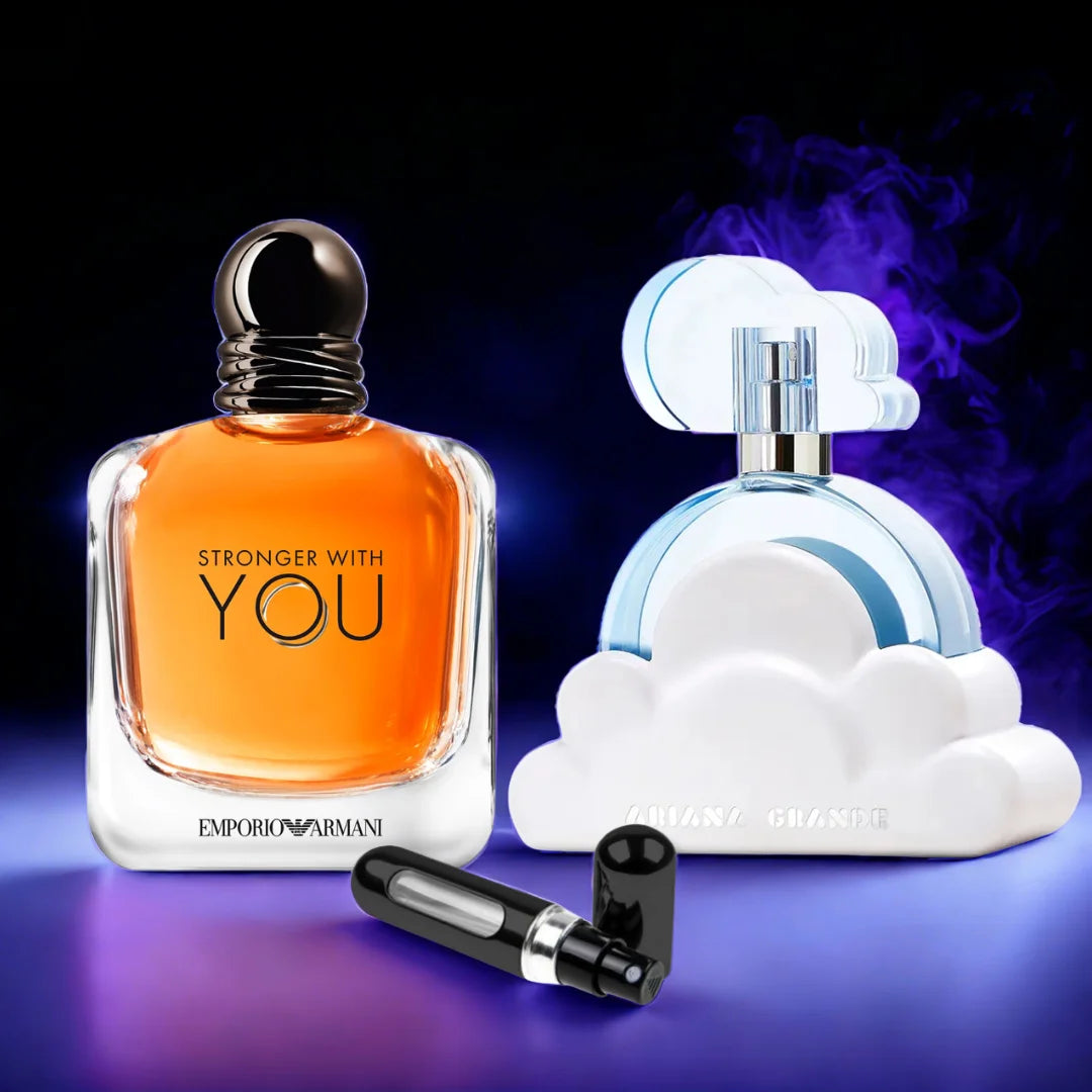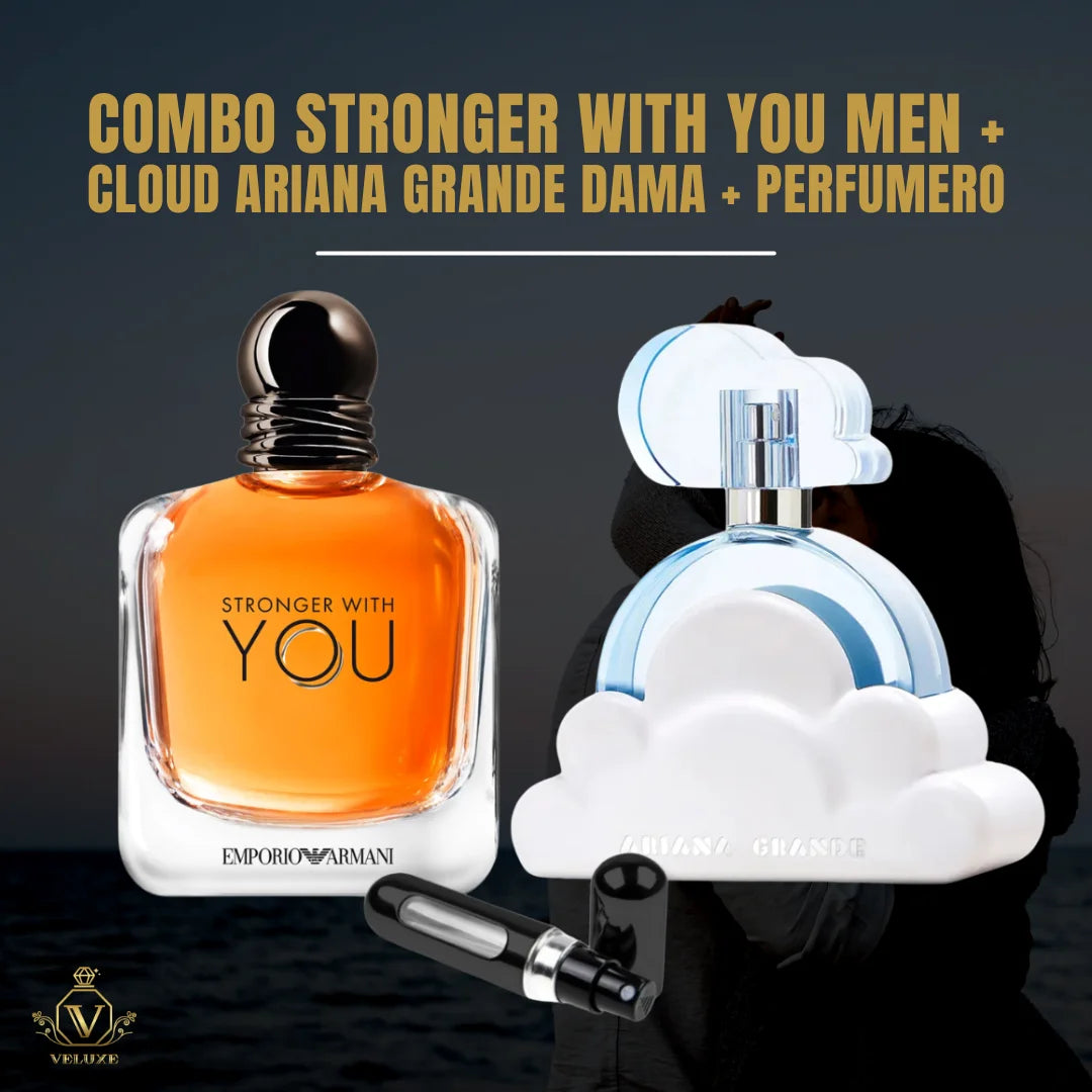 Este combo une la intensidad masculina de Stronger With You de Emporio Armani con la dulzura etérea de Cloud de Ariana Grande, creando una experiencia olfativa perfecta para parejas que buscan complementar sus aromas.
