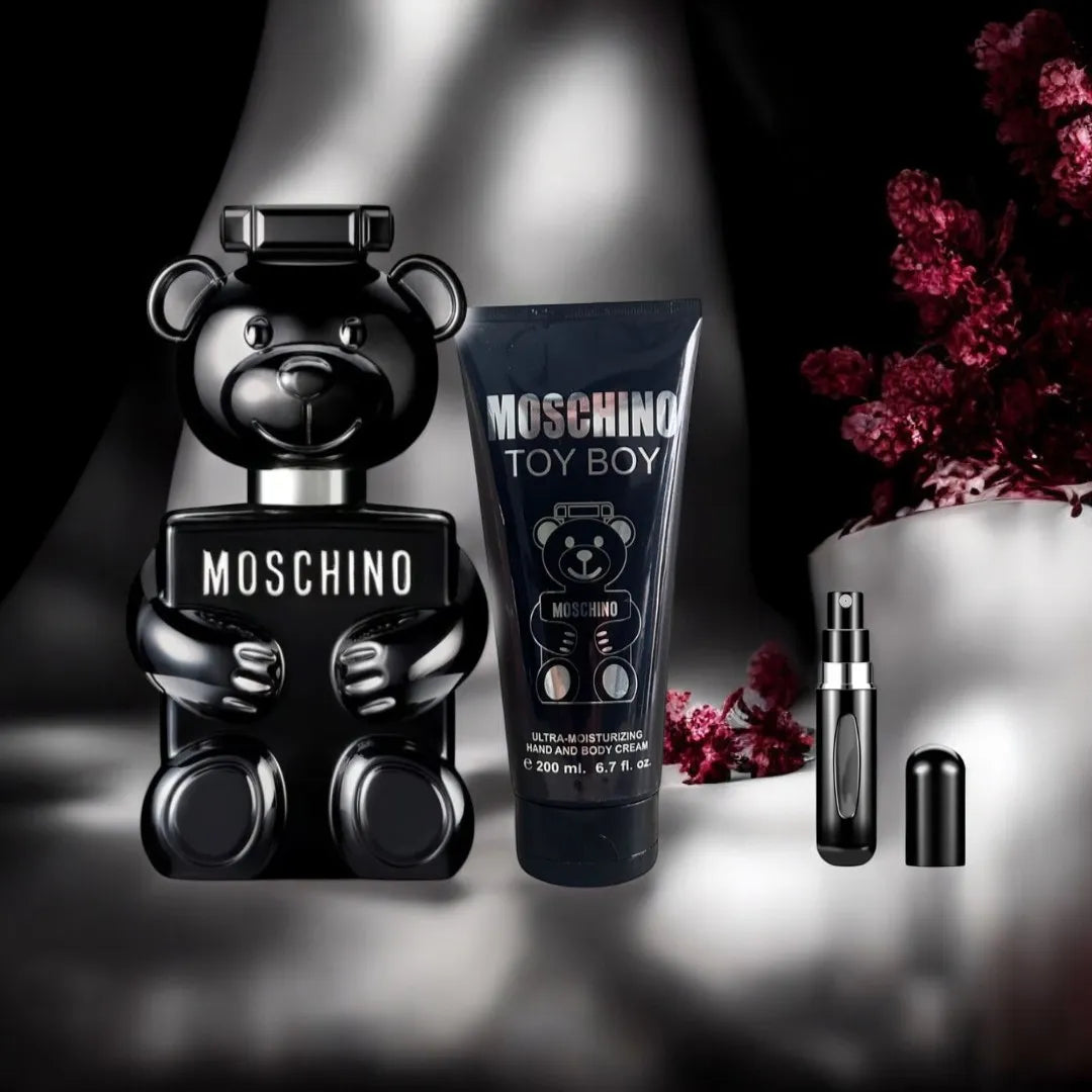 Este combo incluye Toy Boy de Moschino, una fragancia masculina única con notas de bergamota, rosa y nuez moscada que le aportan frescura y profundidad, junto a una crema corporal que hidrata y suaviza la piel, completando la experiencia. Ideal para quienes buscan una combinación de intensidad y cuidado.