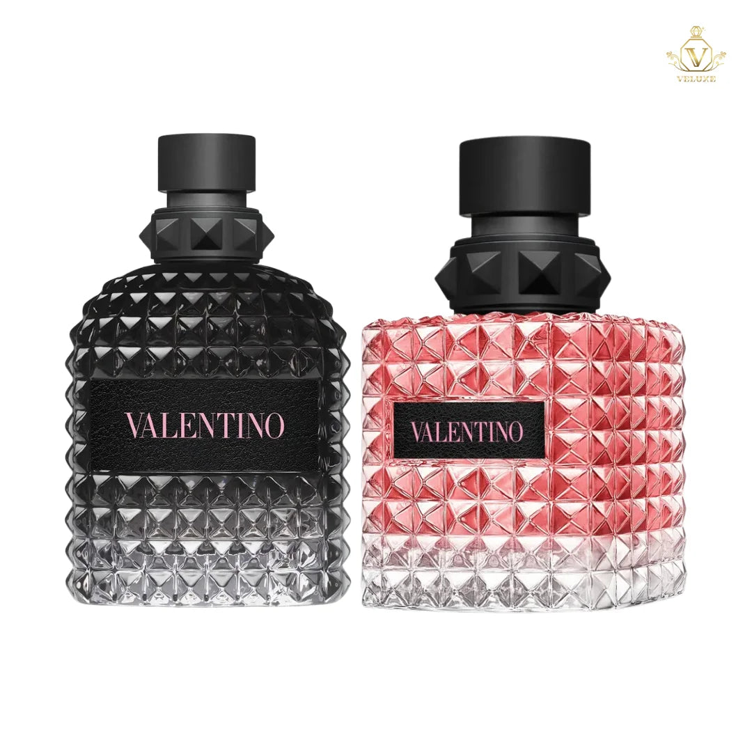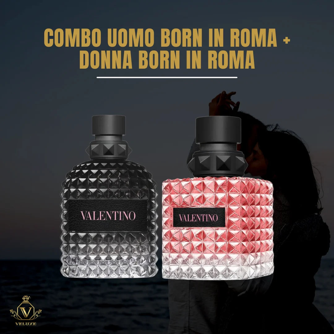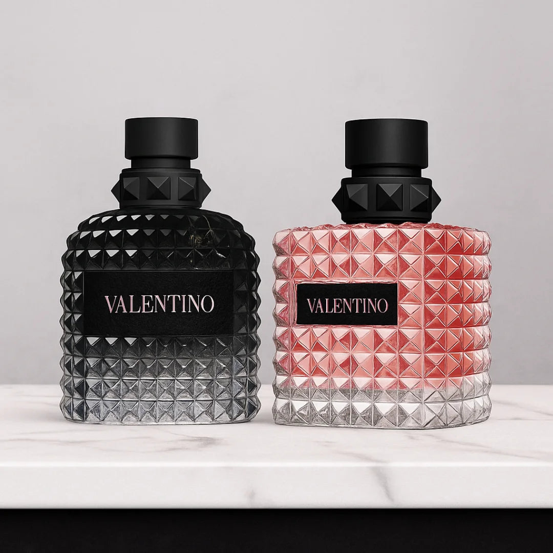 El combo une Uomo Born in Roma, con su salida vibrante de violeta y sal mineral, y Donna Born in Roma, con notas de grosella negra y bergamota, para ofrecer una experiencia olfativa que transita entre la frescura urbana y la sofisticación cítrica
