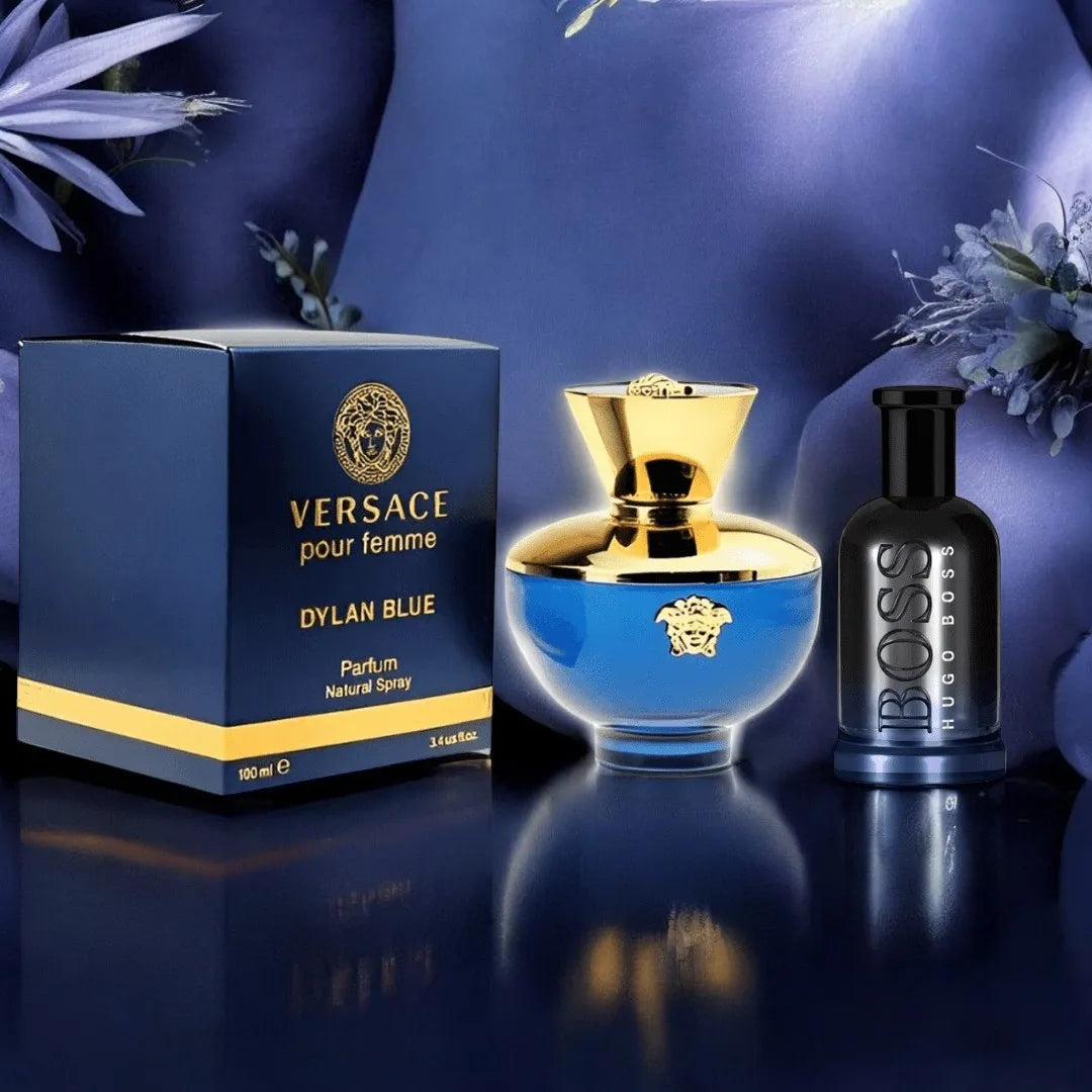 Este combo reúne Dylan Blue de Versace, una fragancia femenina con notas de grosella, manzana y rosa silvestre que aportan frescura y elegancia, junto a Boss Night de Hugo Boss, una esencia masculina intensa con toques de lavanda y abedul. Perfecto para parejas que buscan destacar con un equilibrio de frescura y profundidad.