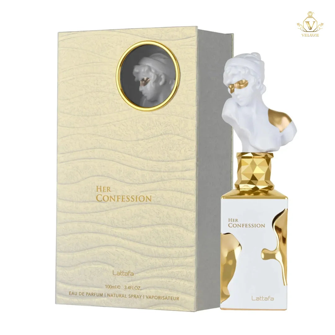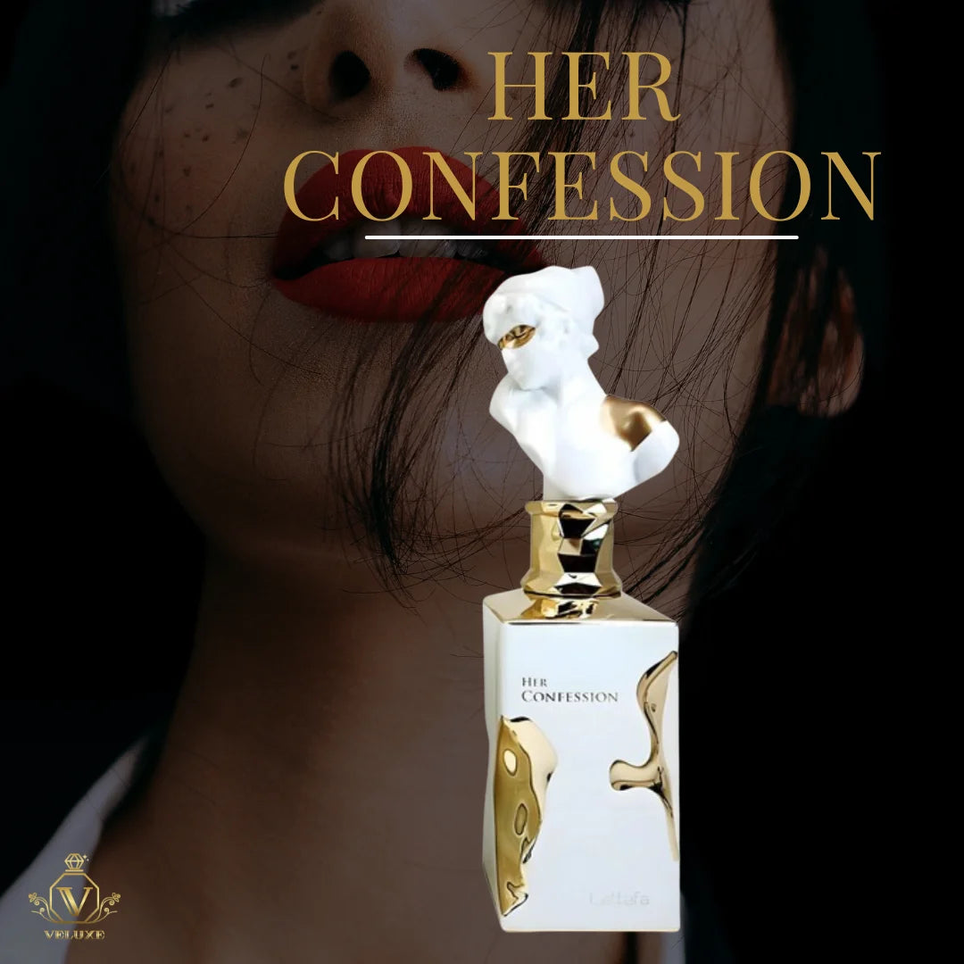 Her Confession abre con un toque de canela y acordes misteriosos que despiertan la curiosidad; luego el jazmín, nardo e incienso le dan un aire floral-etéreo, y su fondo de vainilla, haba tonka y almizcle deja una estela cálida, sensual y duradera.