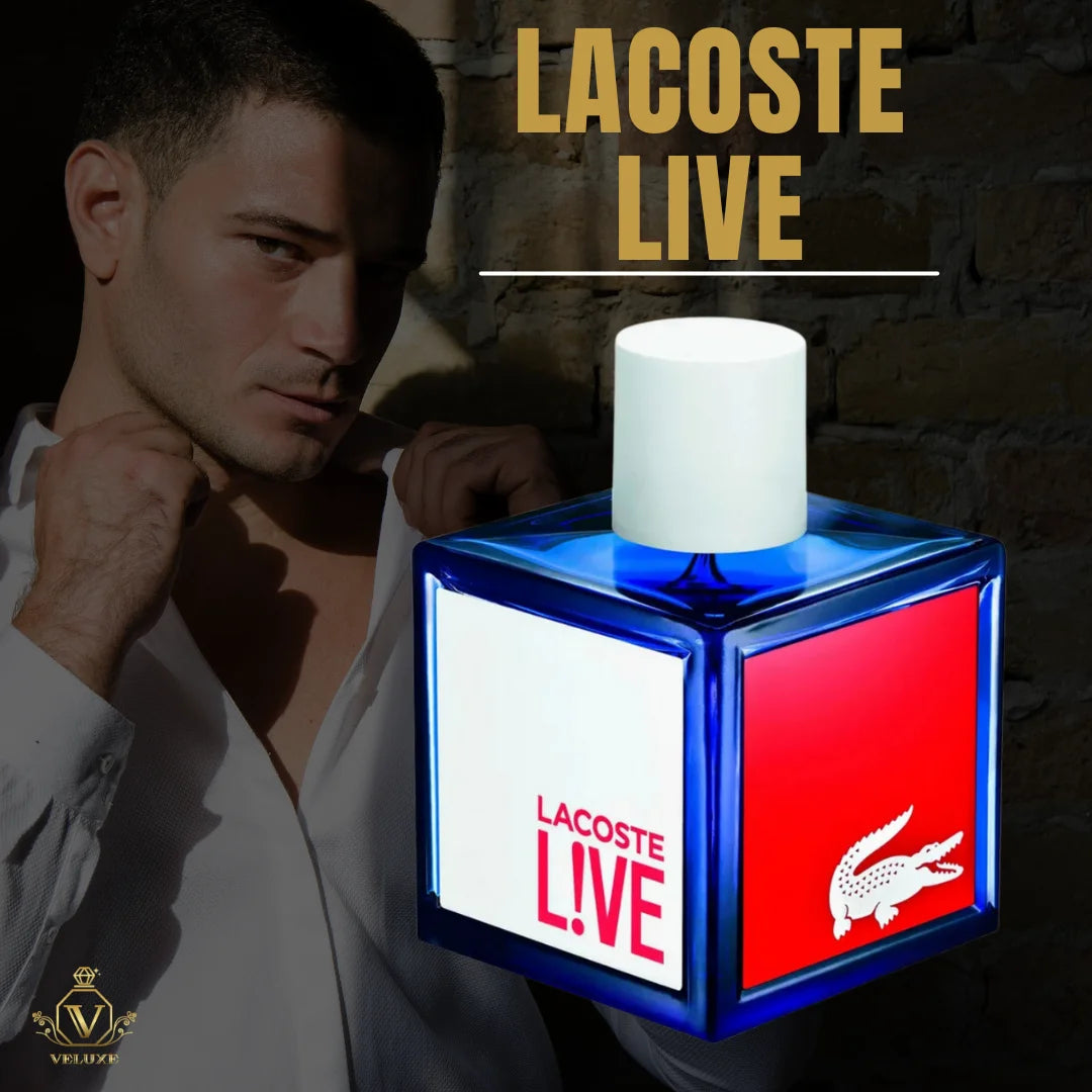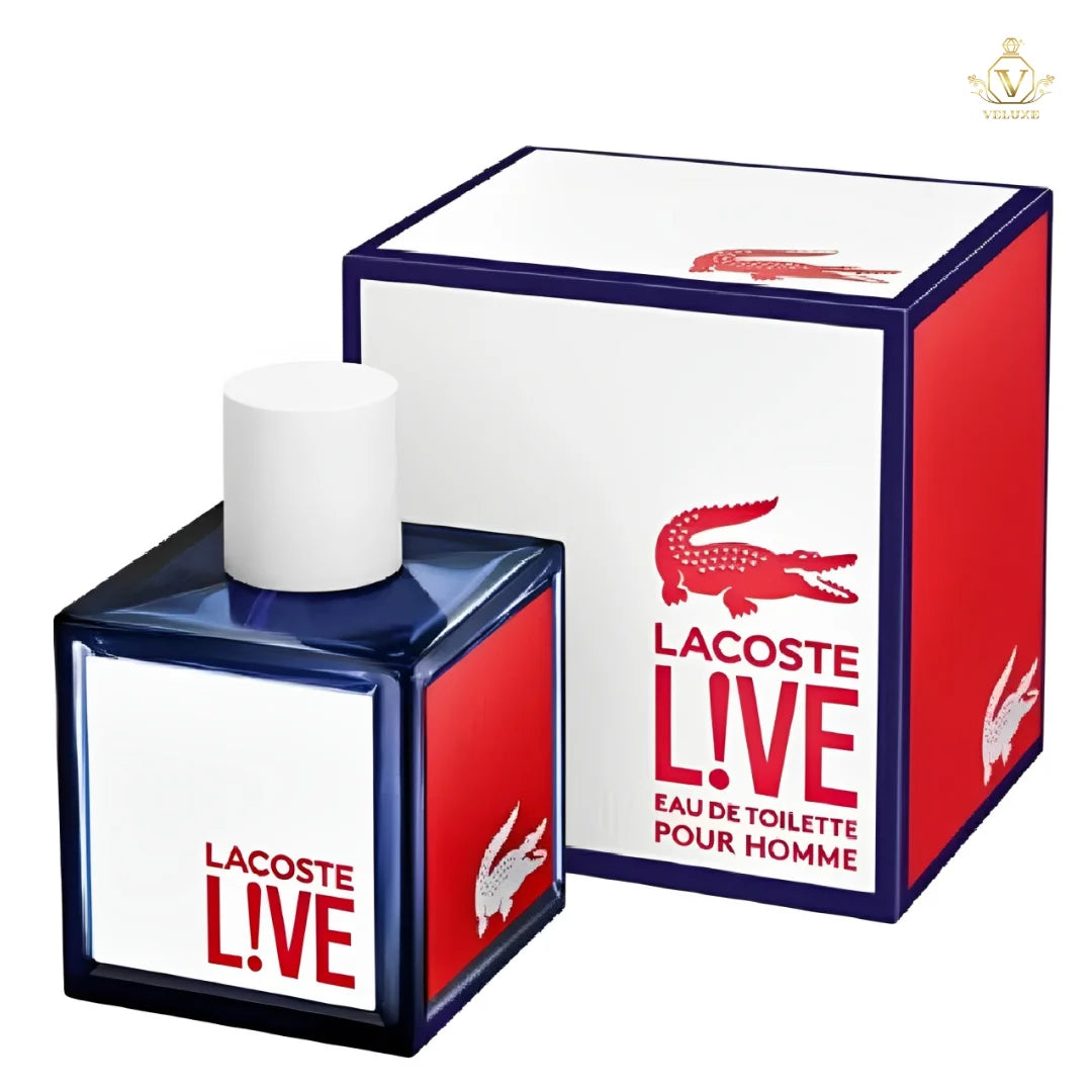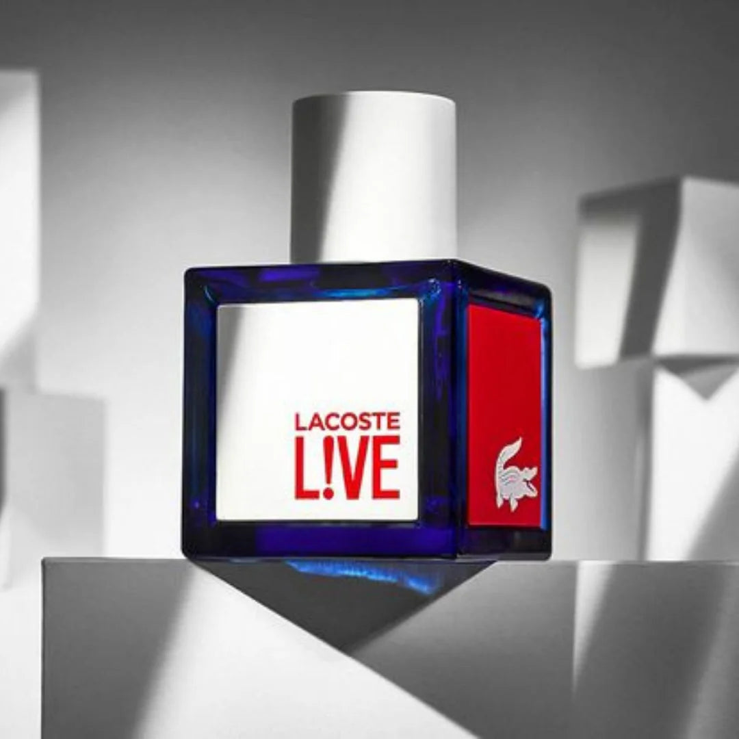 El frasco cúbico de Lacoste Live, con sus colores azul marino, blanco y rojo, refleja la esencia contemporánea y dinámica de la fragancia, convirtiéndolo en un objeto de deseo tanto por su aroma como por su estética.