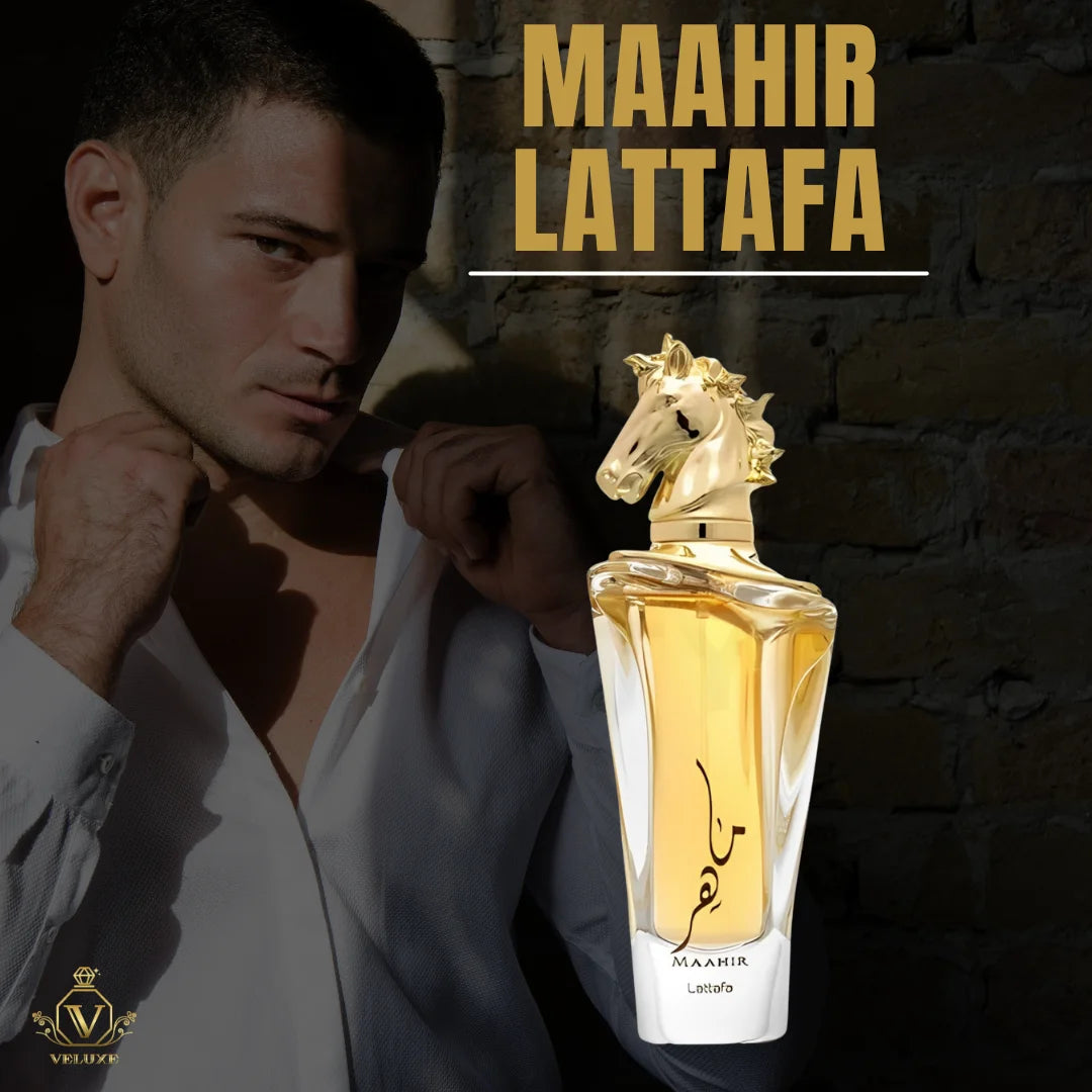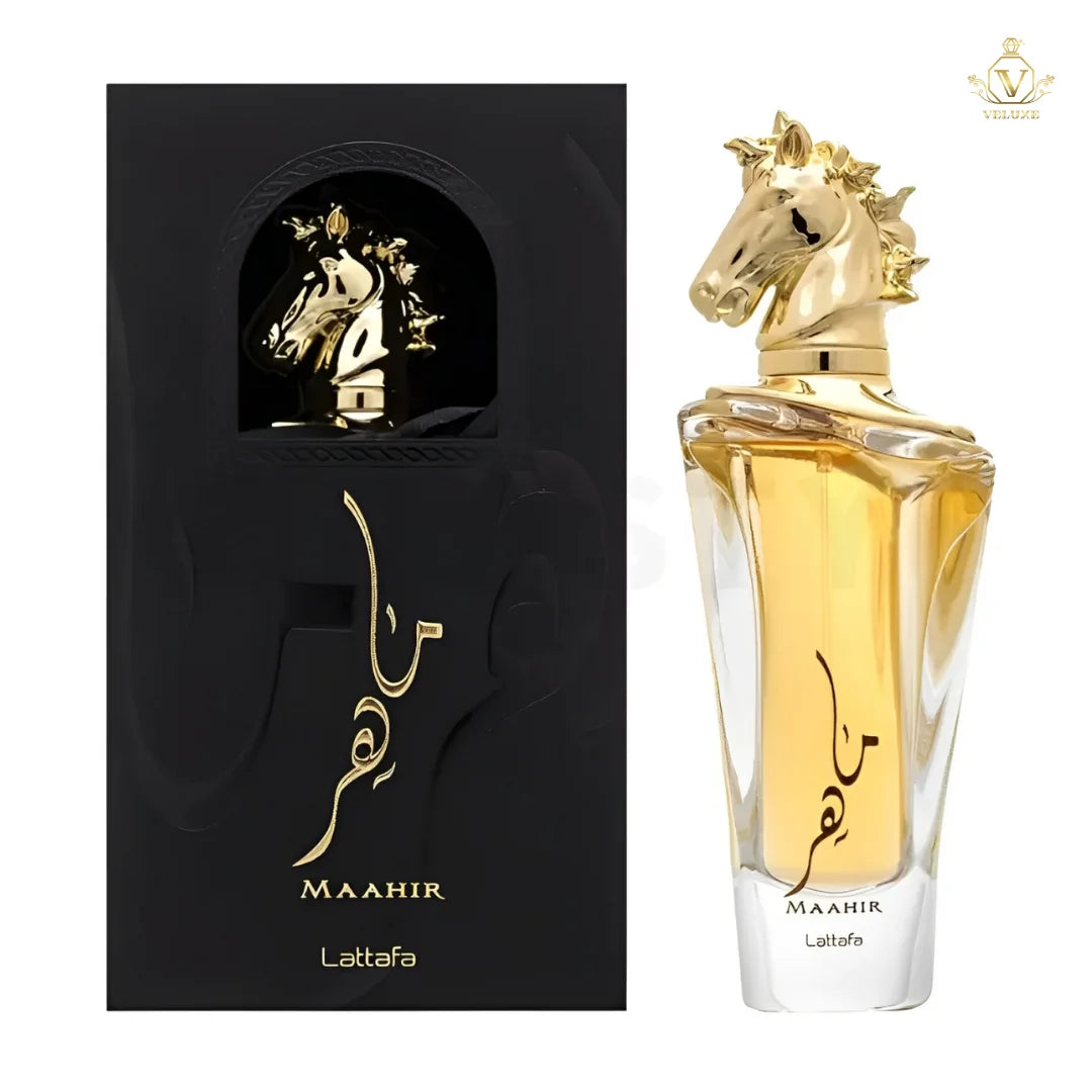 El diseño de Maahir no pasa desapercibido: su frasco elegante coronado con una cabeza de caballo dorada simboliza fuerza y nobleza. Este detalle no solo embellece tu tocador, sino que también anticipa la majestuosidad del aroma que contiene.